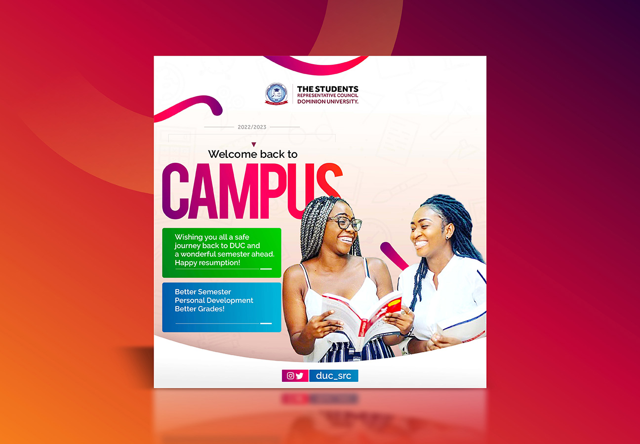 A digital flyer designed for Dominion University College Student Representative Council, welcoming students back to school by our creative design team.