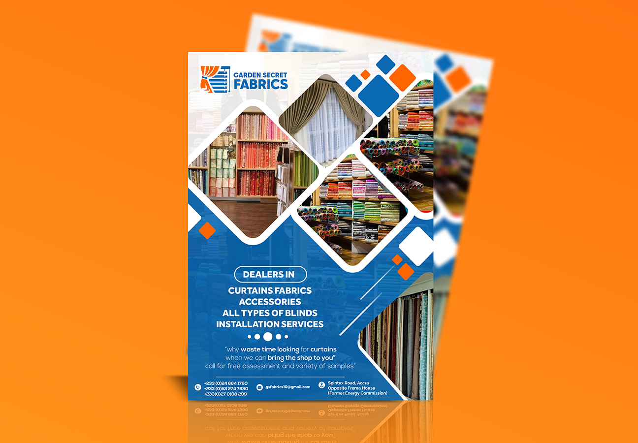 An outstanding flyer design concept for Garden City fabrics, A Chineese company based in Ghana that deals in curtains, blinds and curtain fabric.